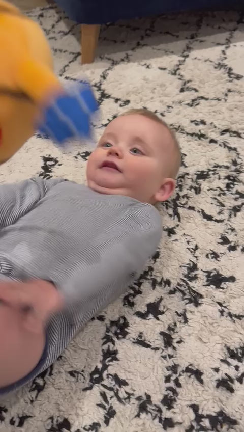 "This is a great engaging toy for baby!" Jess wrote "The basketball has a rattle inside which keeps baby engaged and is good for motor skill development. It also has crinkle paper in the hands and my baby loves to nibble on the little feet."